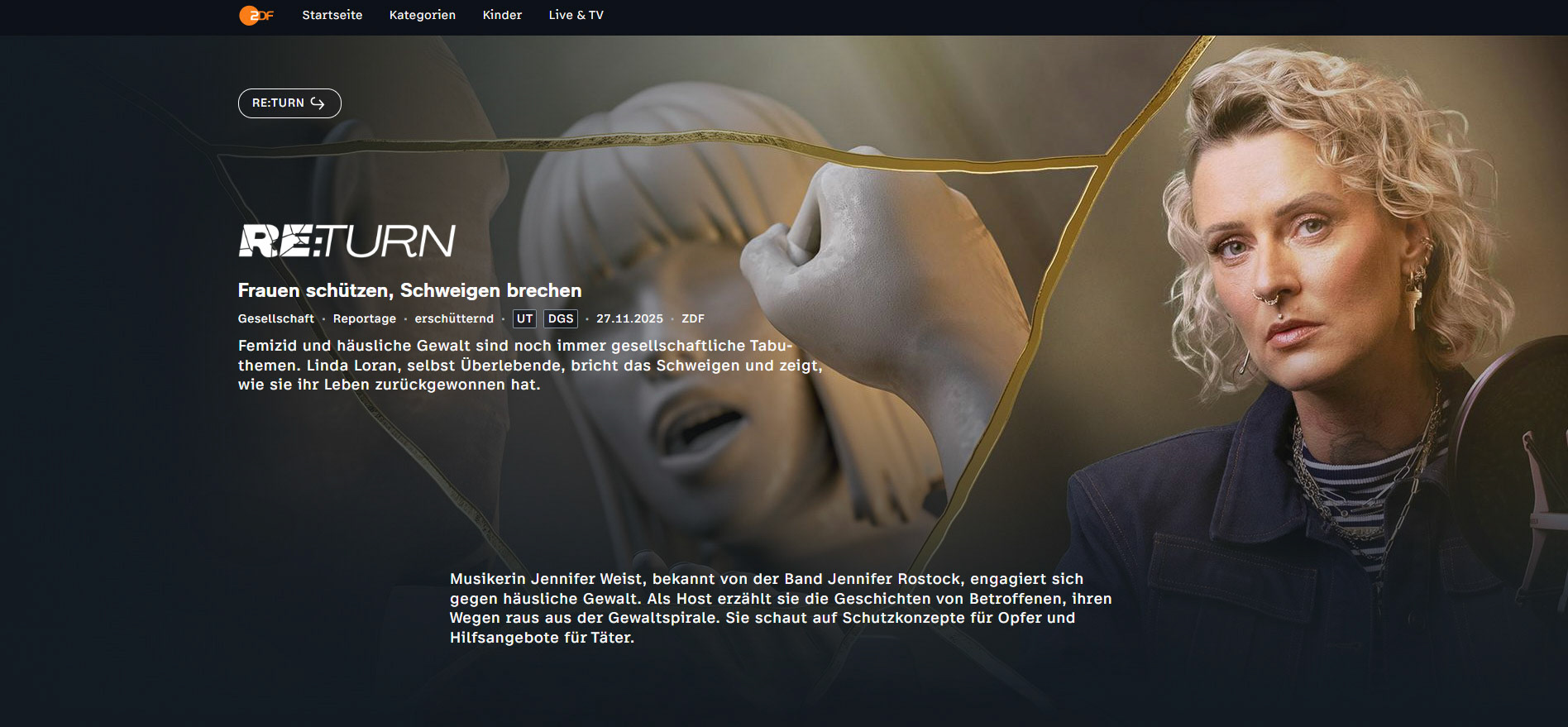 In the series “Re:turn,” a ZDF production, musician Jennifer Weist explores the issue of domestic violence and follows survivors on their journey toward self-determined lives. Personal stories reveal how the courage to change can emerge and how perpetrators can take responsibility for their actions. Innovative protection measures and prevention strategies broaden the perspective. A powerful series about new beginnings, hope, and breaking free from cycles of violence.